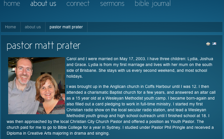 This is a current screen shot of his bio page at http://www.newhopebrisbane.org/index.php/about-us/pastor-matt-prater